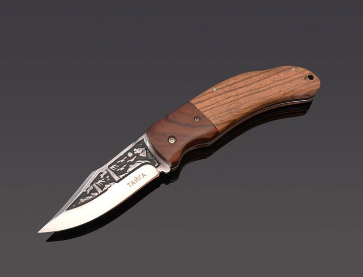 Kvalitný celokovový ruský nôž Tajga, ktorý má čepeľ čierno-striebornej farby. Vrchná časť rúčky a povrch čepele má 3D gravírovanie. Črienky rúčky sú vyrobené z afrického exotického dreva sapeli, ktoré je tvrdé, ľahké a veľmi odolné. Je ergonomická a výborne sadne do ruky. Čepeľ je zaistená poistkou backlock. Veľmi pevný a kvalitný nôž, nerezová čepeľ je vyrobená z ocele 65x13(tvrdosť HRC56-58)-ruský ekvivalent ocele 440B. Táto oceľ je veľmi trvácna a tvrdá, o čom svedčia aj rôzne ocenenia na medzinárodných fórach. Praktické púzdro z nylonu dostávate v cene. Možnosť gravírovania venovania, čísla (výročie), či mena (za poplatok) do čepele. Super kvalita za super cenu. Pekný darček, ktorý poteší hlavne chlapov, poľovníkov, rybárov, turistov. Pekný kúsok aj pre zberateľa.
