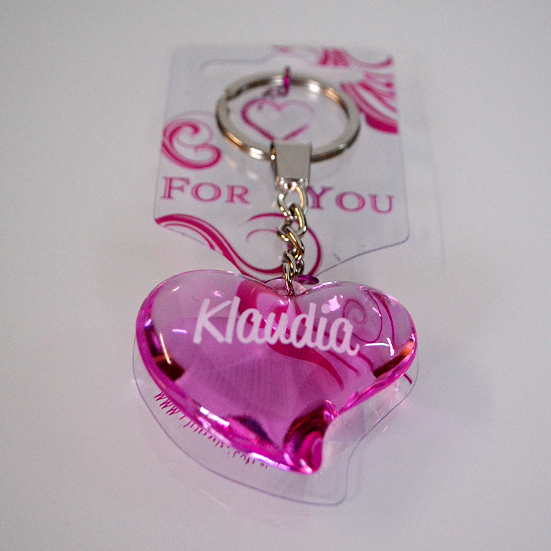 Exkluzívny prívesok v tvare srdca s menom. Prívesok má chrómovanú retiazku a chrómovanú karičku. Môžete ho použiť ako kľúčenku alebo ako ozdobu napr.nohavíc, peňaženky, kabelky atď.