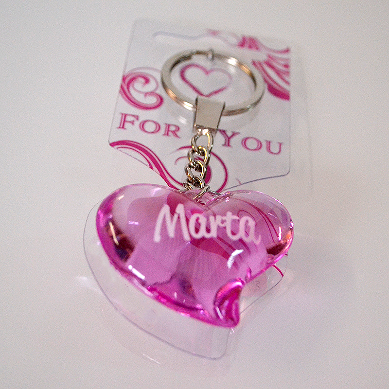 Exkluzívny prívesok v tvare srdca s menom. Prívesok má chrómovanú retiazku a chrómovanú karičku. Môžete ho použiť ako kľúčenku alebo ako ozdobu napr.nohavíc, peňaženky, kabelky atď.