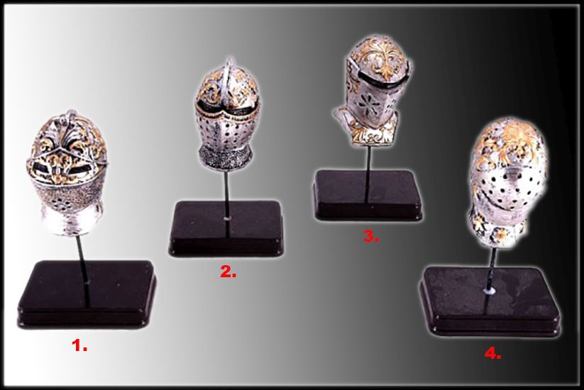 Rytieri boli už od stredoveku známi svojimi špeciálnymi brneniami, ktorých samozrejmou súčasťou boli aj prilby. Ponúkame Vám štyri vzory zmenšenín takýchto stredovekých rytierskych prilieb. Vyrobené sú z unikátneho kompaktného materiálu polyston, ktorý vzniká spojením vysokokvalitnej živice a prírodného materiálového plniva. Výška každej rytierskej helmy s podstavcom je 14 cm. Vzor si prosím vyberte z číselníka.