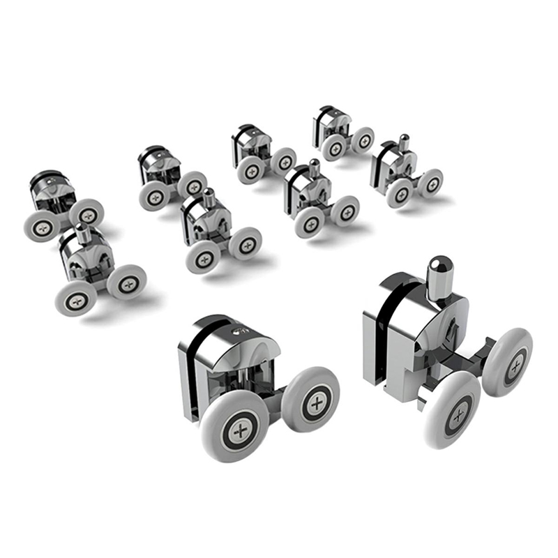 Sada 8 pevných, pochrómovaných dvojitých koliesok do sprchového kúta.