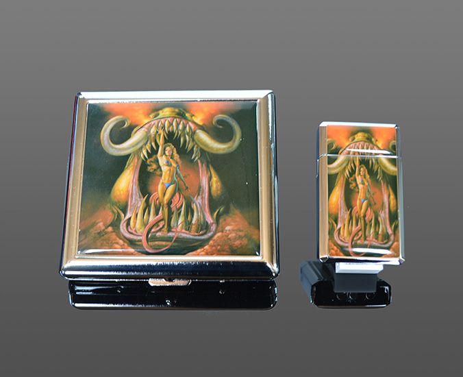 Puzdro so zapaľovačom s turbo plameňom v dekore Amazonka s mamutom. Balené v blistri.