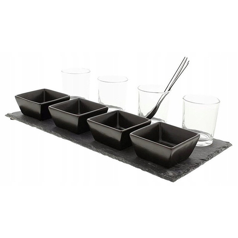 Charakteristika - materiál : keramika, sklo, bridlica; rozmer celej sady na prílohy je cca 30 x 15,5 cm; sada obsahuje poháre, misky a lyžice pre 4 osoby;
