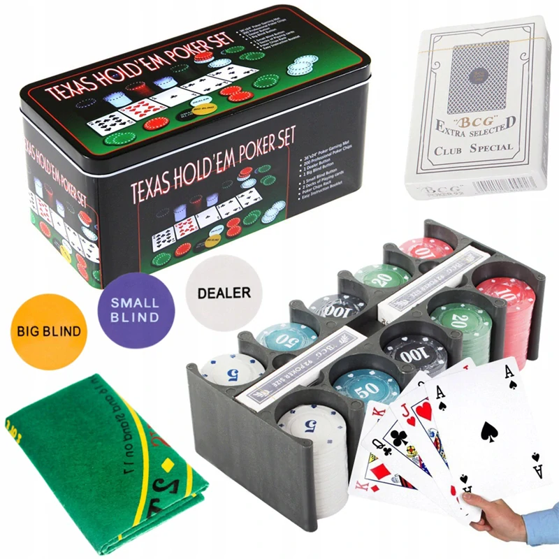 Tento profesionálny pokerový set TEXAS je ideálny pre všetkých nadšencov kartových hier – od začiatočníkov až po skúsených hráčov. Obsahuje 200 kvalitných žetónov, 2 balíčky kariet, funkčné žetóny a veľkú pokrovú podložku až pre 6 hráčov. Všetko je prakticky zabalené v elegantnom hliníkovom kufríku, vďaka ktorému si hru môžete vziať kamkoľvek so sebou.