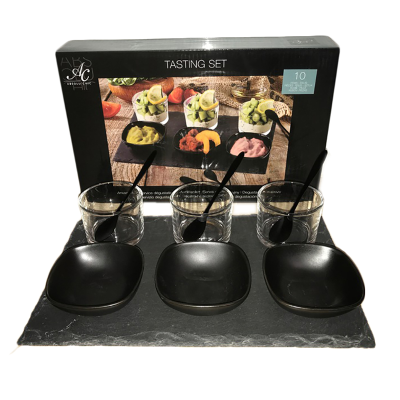 Súprava bola umiestnená na podnose z bridlicového kameňa. Podnos vyrobený z prírodného kameňa bude elegantným dekorom stola, kde môžete podávať omáčky, dipy alebo malé predjedlá.
