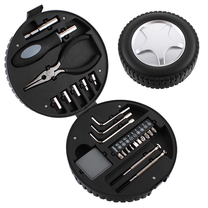 Kompletná sada nástrojov s až 25 prvkami. Perfektný darček pre motoristov a domácich majstrov. Všetky nástroje sú vyrobené z pevných materiálov a perfektne padnú do ruky, vďaka čomu sú vhodné aj pre profesionálov. V originálnom kufríku v tvare pneumatiky je miesto pre množstvo kľúčov a doplnkového príslušenstva (hroty, nástrčky atď.).
