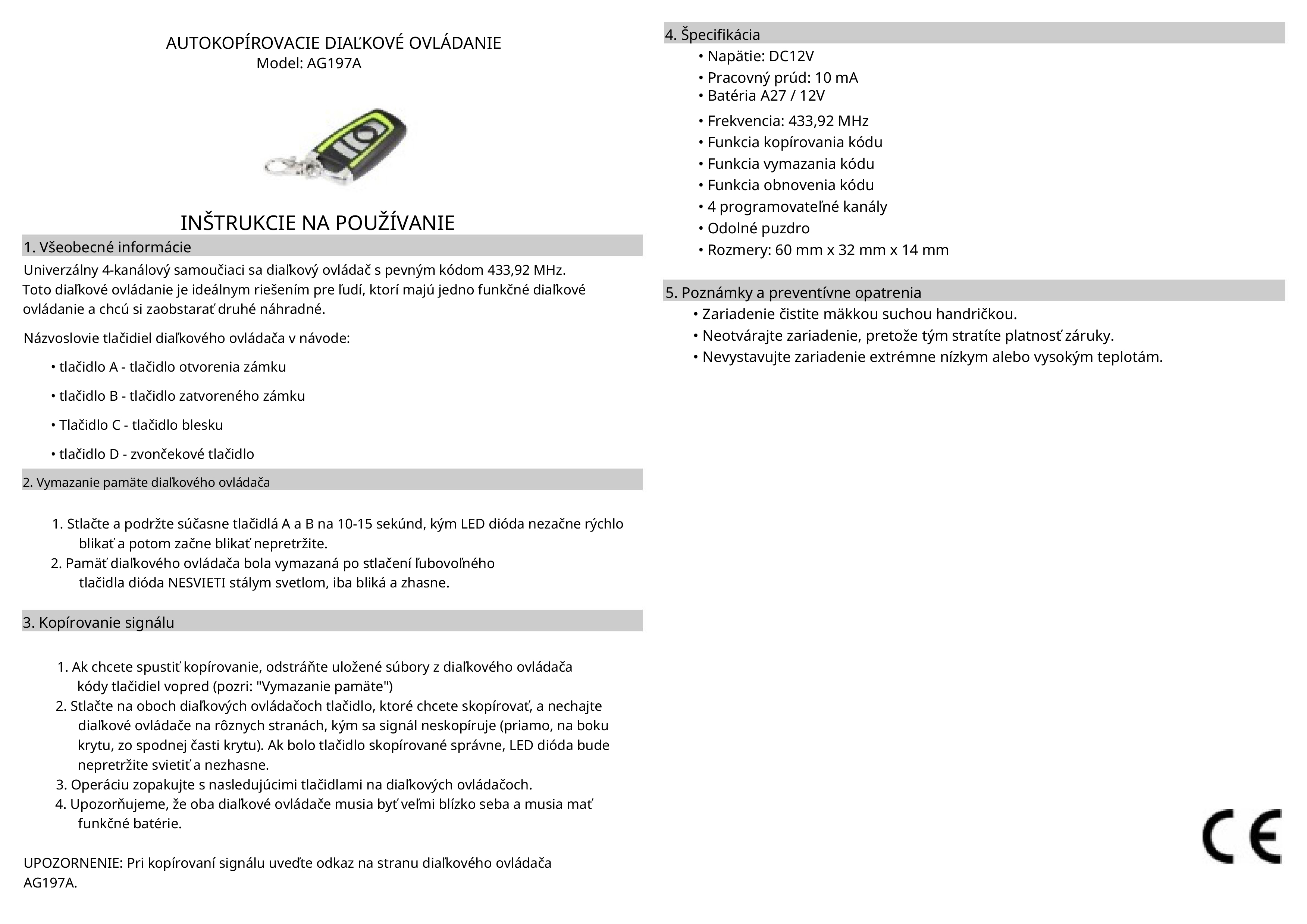 Toto kompaktné a odolné diaľkové ovládanie je určené ako náhradné alebo doplnkové ovládanie pre zariadenia pracujúce na frekvencii 433,92 MHz s pevným kódom. Je špeciálne vhodné pre používateľov, ktorí potrebujú jednoduchý spôsob skopírovania signálu existujúceho diaľkového ovládania (brány, garážové otvárače, spínače, ovládače roliet, alarmy a pod.). Elegantné plastové telo s chrómovými vložkami a praktickým krúžkom na kľúče sa ľahko nosí a dobre vyzerá.