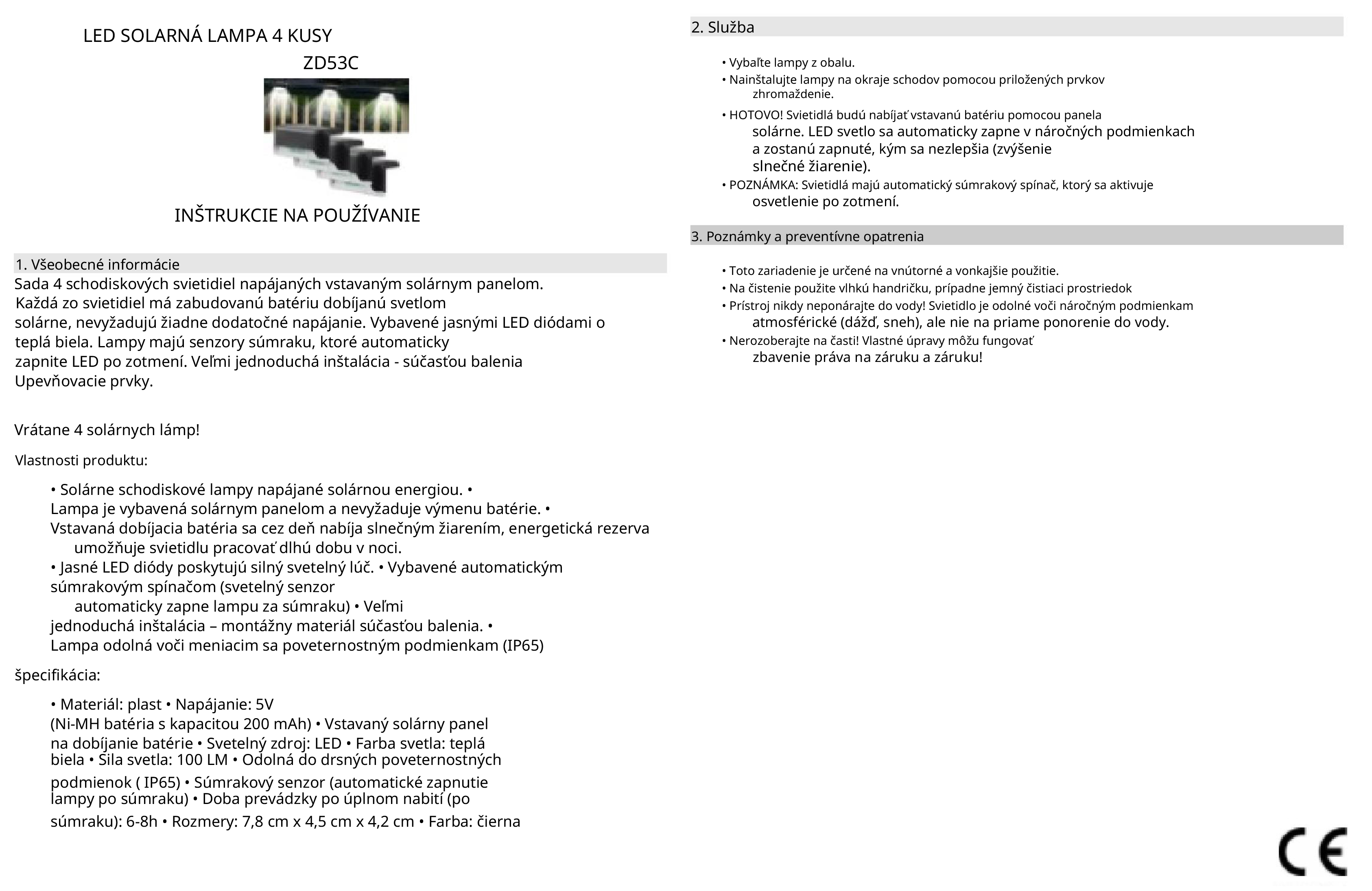 - Po nabití batérie počas dňa sa lampa po zotmení sama zapne a zabezpečí osvetlenie až na 8 hodín.