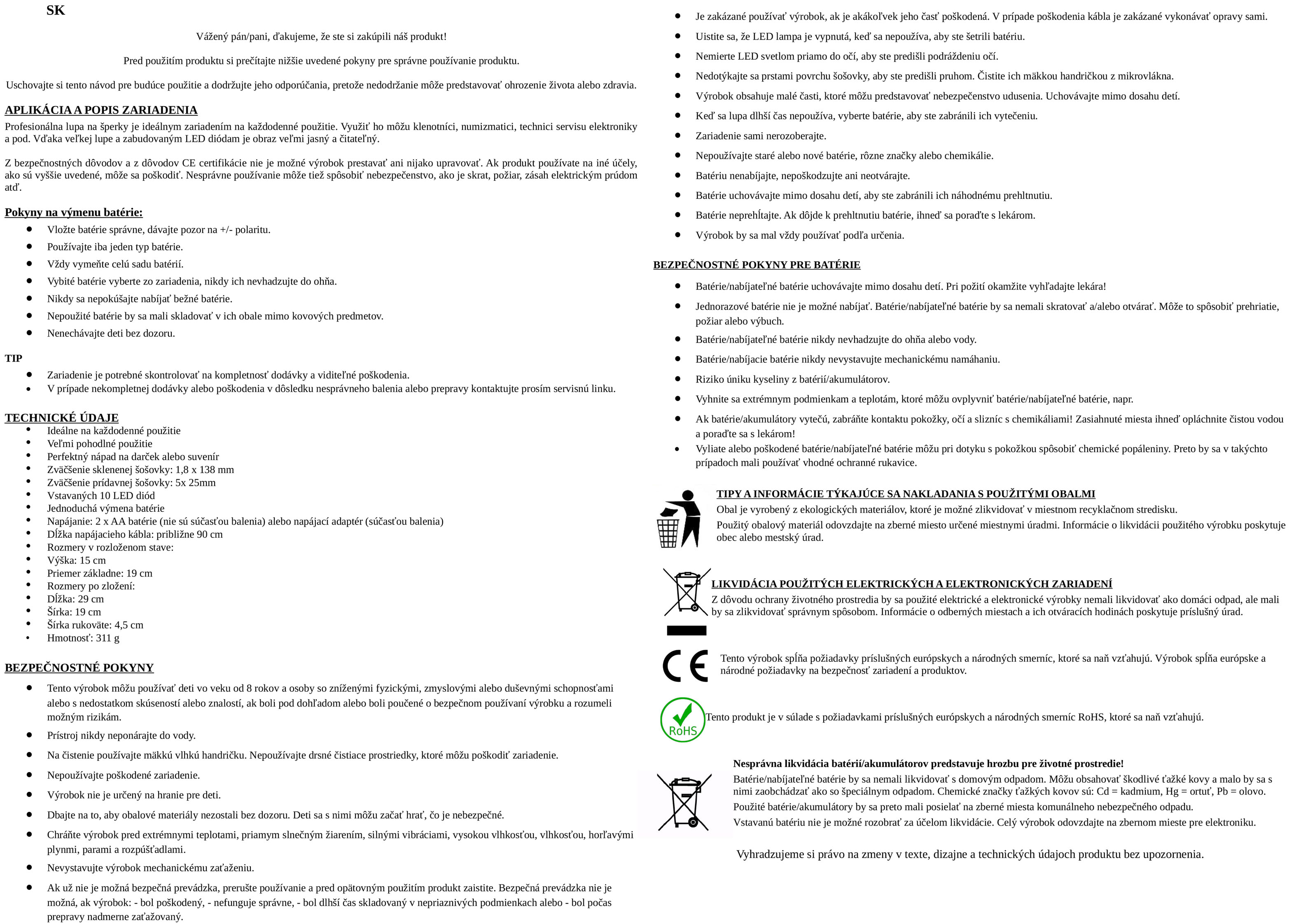 Lupa je vybavená hlavnou šošovkou a menšou prídavnou šošovkou s väčším zväčšením. Integrované LED osvetlenie pomáha zlepšiť viditeľnosť detailov aj pri slabšom svetle.