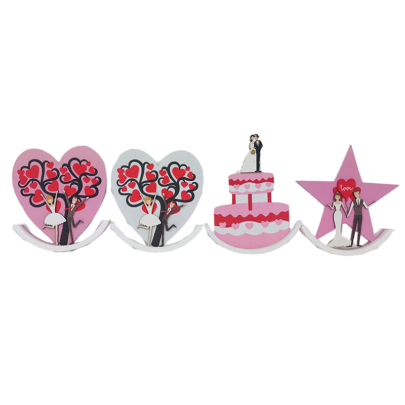 Na výber máme romantické srdce v ružovej alebo v bielej farbe, pre hviezdnych mladomanželov ružovú hviezdu a pre milovníkov jedla svadobnú tortu. Všetky dekorácie sú na drevenom polkruhovom podstavci, vedia sa teda kolísať zo strany na stranu