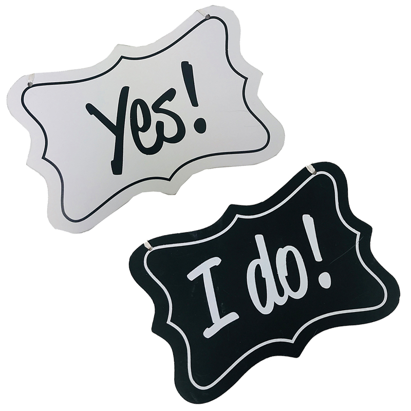 Na tabuľkách je nápis Yes!alebo I do! (v preklade Áno!/Vezmem!). Každá z tabuliek je zavesená na bielej stuhe. Typ si vyberte z ponuky.