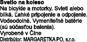 Svetlo na bicykel s LED svetielkami. Svetlo sa pripája na špice bicykla, pri točení kolies vytvára farebné kruhy, čím zabezpečí vysokú viditeľnosť. Možnosť 3 režimov svietenia: rýchle blikanie, pomalé blikanie, farebné prelínanie. Napájanie na 2 batérie CR2032.