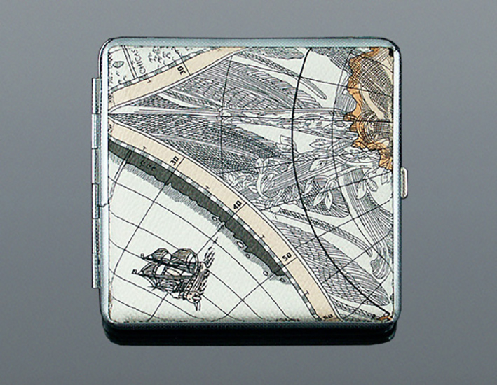 Tabatierka na cigarety je vyrobená z vysokokvalitnej nerezovej ocele. Pokrytá je imitáciou kože s motívom námorníckej mapy. Na 20 cigariet dĺžky 8,5 cm. Cena sa týka výlučne obalu na cigarety! Rozmery púzdra na cigarety sú : 95 x 95 mm.