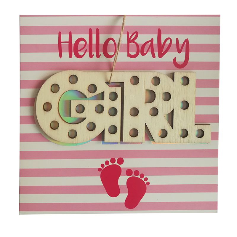 Tabuľka na zavesenie s nápisom Girl, čo v preklade znamená dievča. K tabuľke je priložená aj darčeková obálka.