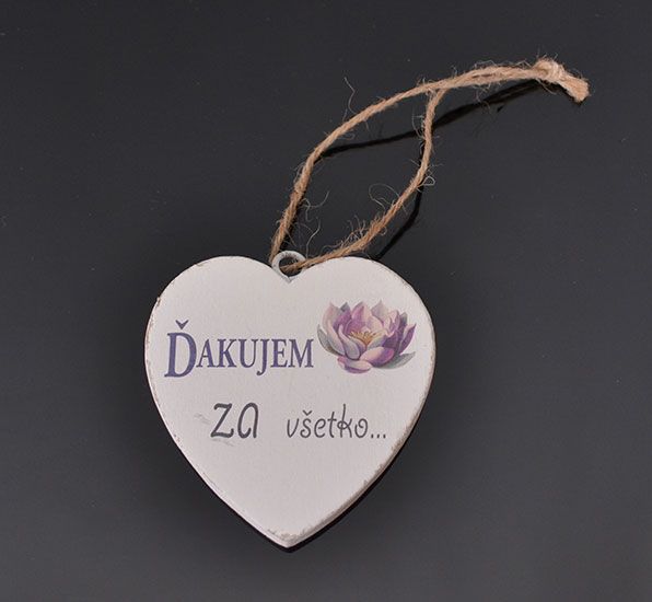 Tabuľka na zavesenie v tvare srdca o rozmere 6,5cm x 7,5cm. Pekný darček - dekorácia vytvorená v retro-provensálskom štýle, ktorý sa hodí do záhrady, domu, bytu a všade tam kde si chcete skrášliť prostredie. Drevený výrobok. Super cena.
