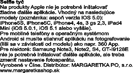 Jedine so selfie teleskopickou tyčou dokážete urobiť unikátne zábery so svojím mobilným telefónom, preto, ak radi fotografujete, si určite zadovážte túto praktickú pomôcku, ktorú Vám ponúkame v bezkonkurenčnej cene. Držiak telefónu má možnosť rotácie až 270°.