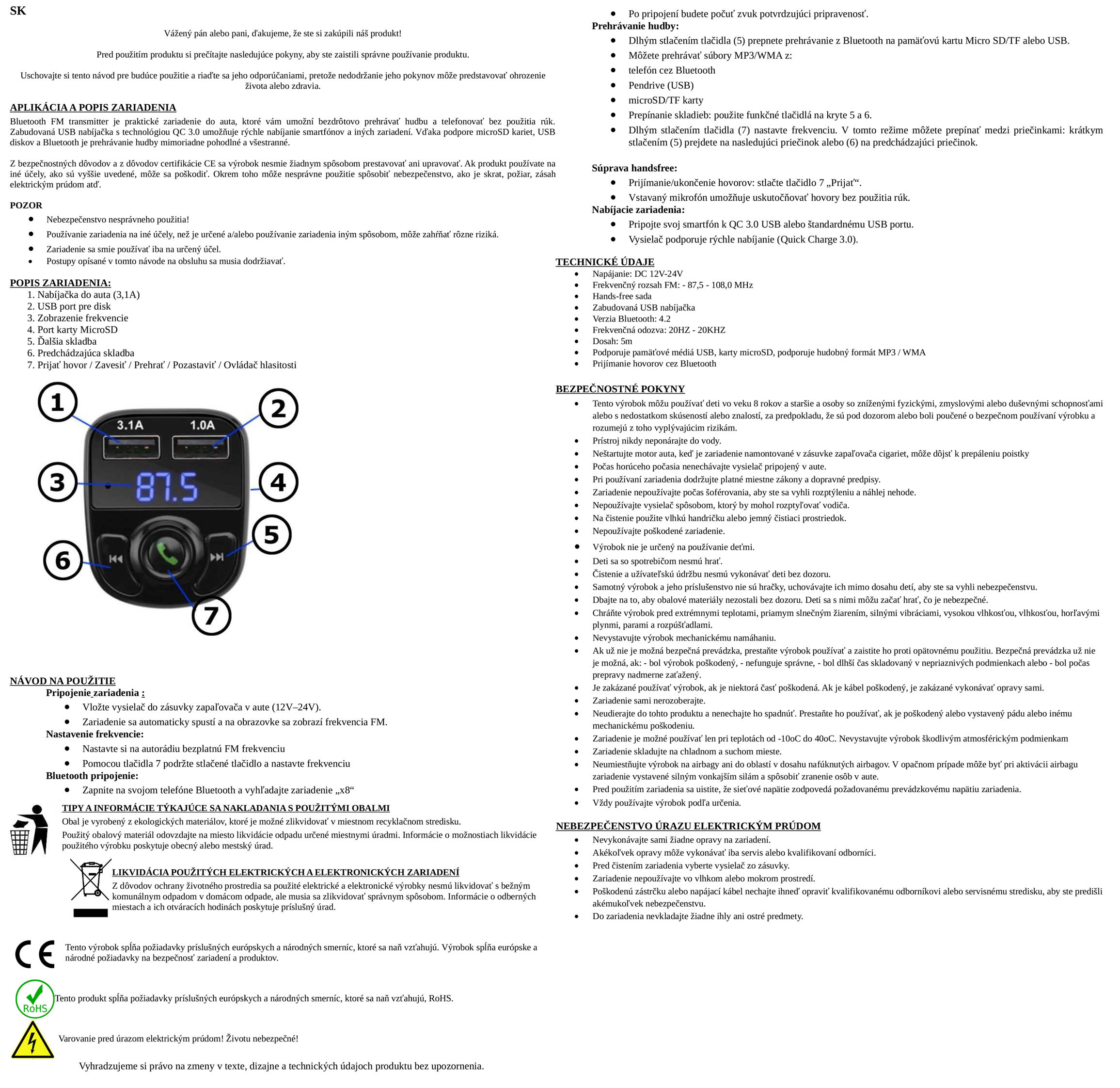 Návod na použitie transmitera FM SD MP3 Bluetooth