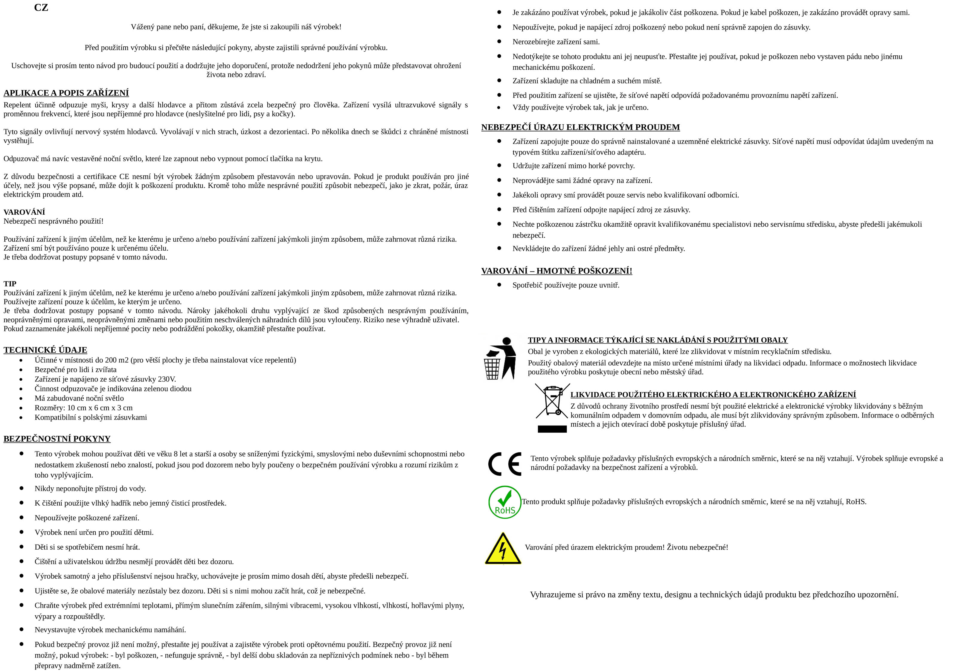 Stačí ho zapojiť do bežnej zásuvky 230 V a odpudzovač okamžite začne pracovať. Zelená kontrolka signalizuje jeho činnosť, takže máš vždy prehľad o tom, že funguje.