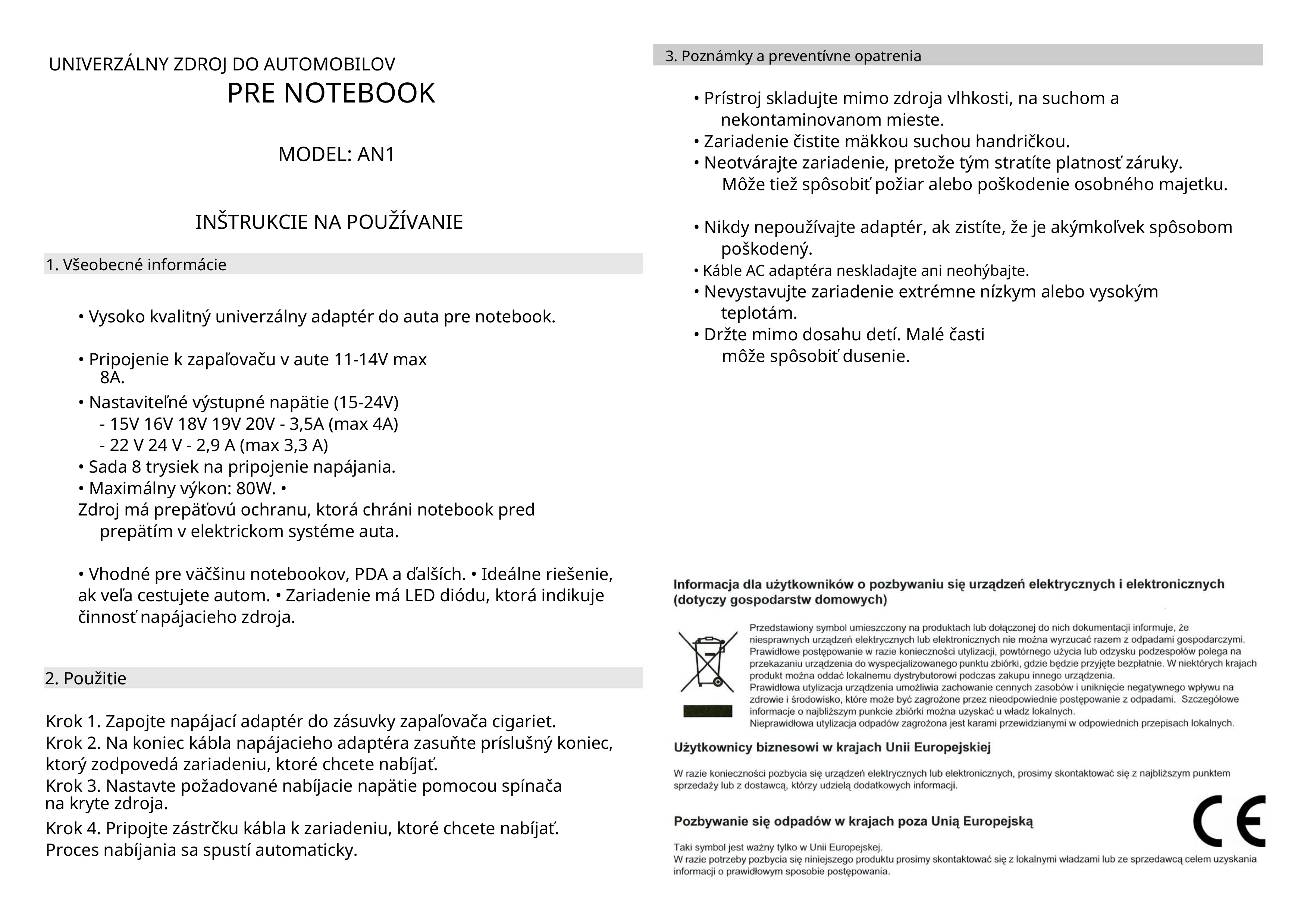 Návod na použitie – Univerzálny adaptér do auta na notebooky