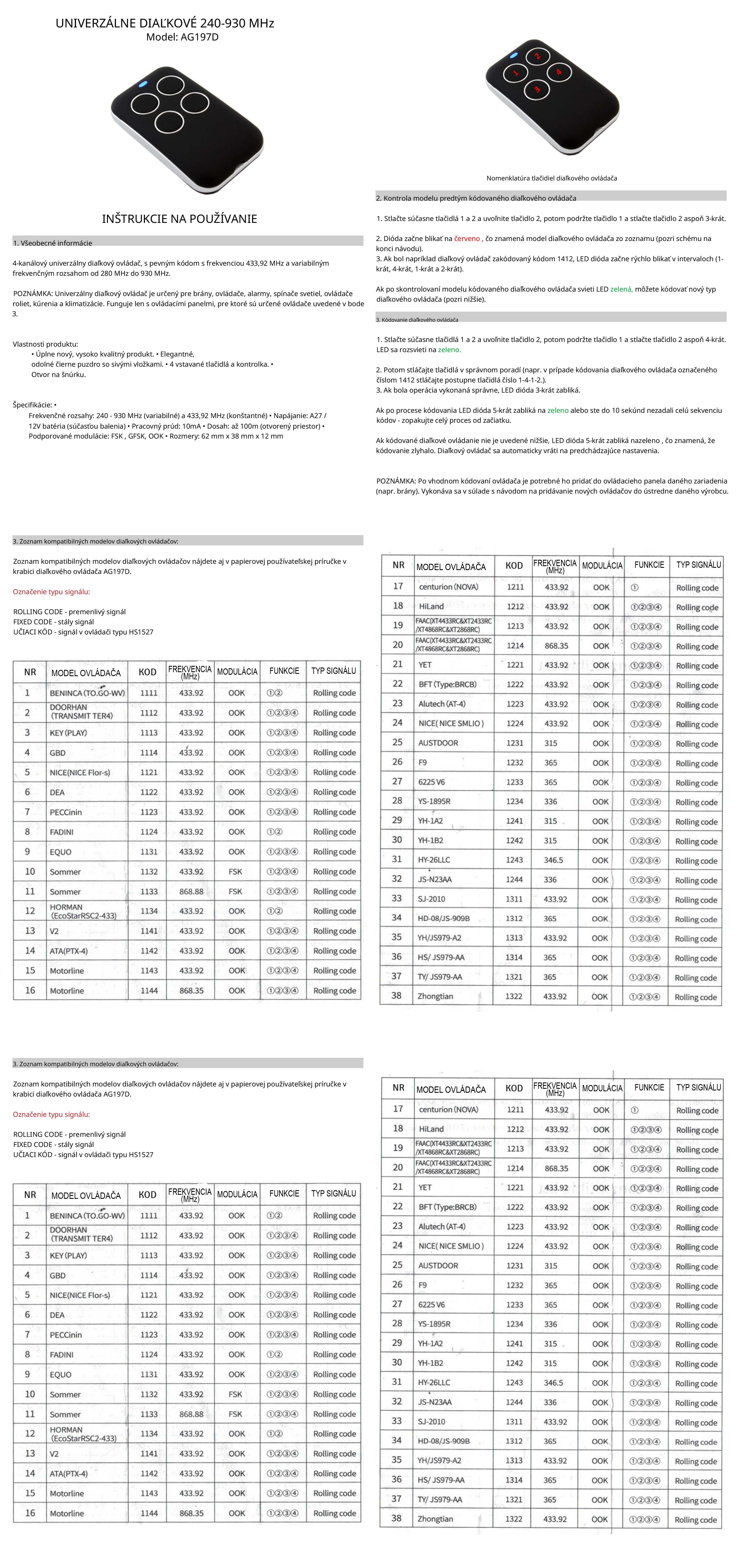 Diaľkové ovládanie pracuje s pohyblivým kódom od 240 do 930 MHz a s pevným kódom 433,92 MHz v uvedenom rozsahu.