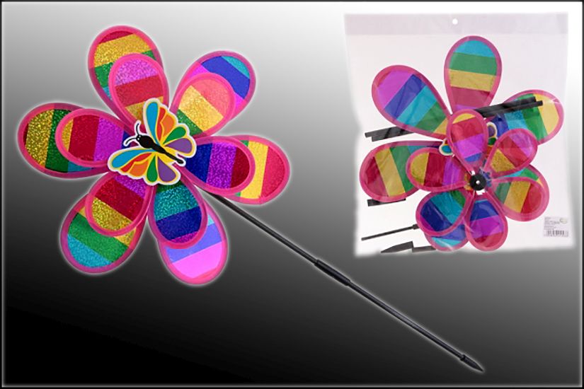 Pestrofarebný veterník na plastovej paličke s hrotom o dĺžke 30 cm. Pekný dekoračný predmet záhrady alebo kvetinových záhonov. Vďaka ostrému hrotu na držiaku sa dá ľahko zapichnúť do zeme alebo do kvetináča. Vhodné aj ako hračka pre deti.