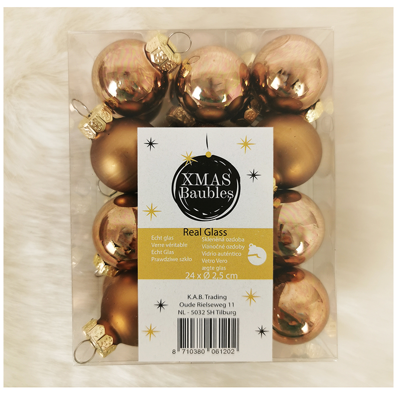 Vianočné gule na stromček s priemerom 2,5cm. Balenie obsahuje 24kusov. Farba: zlatá.