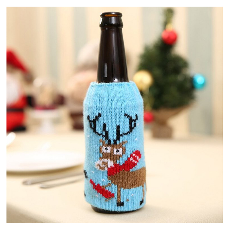 Obal fľaše v tvare svetra so sobom v modrej farbe. Skvelý nápad na ozdobenie fľaše vína alebo šampanského. Ideálne ako vianočná ozdoba.