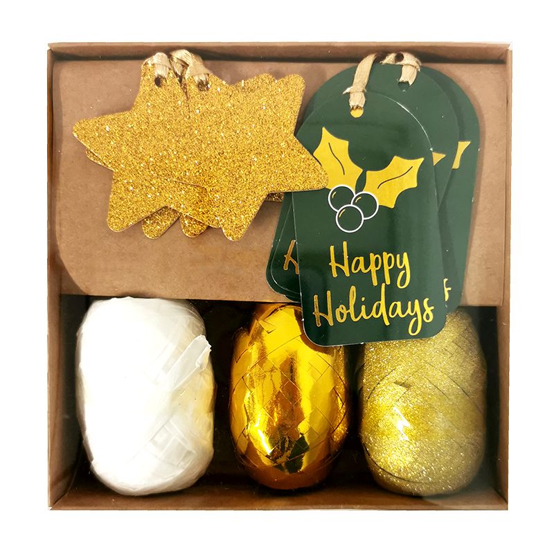 Vianočný dekoračný set obsahuje stuhy pomocou ktorých môžete zabaliť aj ozdobiť darčeky a štítky na darčeky. Stuhy aj štítku su v pekných vianočných farbách.