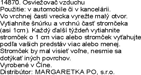 Osviežovač do auta sa pripevňuje na mriežku. Po zasuntí držiaka s gélovou voňavou vložku pripevnite na koniec fluorescenčnú koncovku - motýľa. Koncovka v tme svieti. Čím dlhšie bude cez deň vystavená svetlu, tým dlhšie bude svietiť.