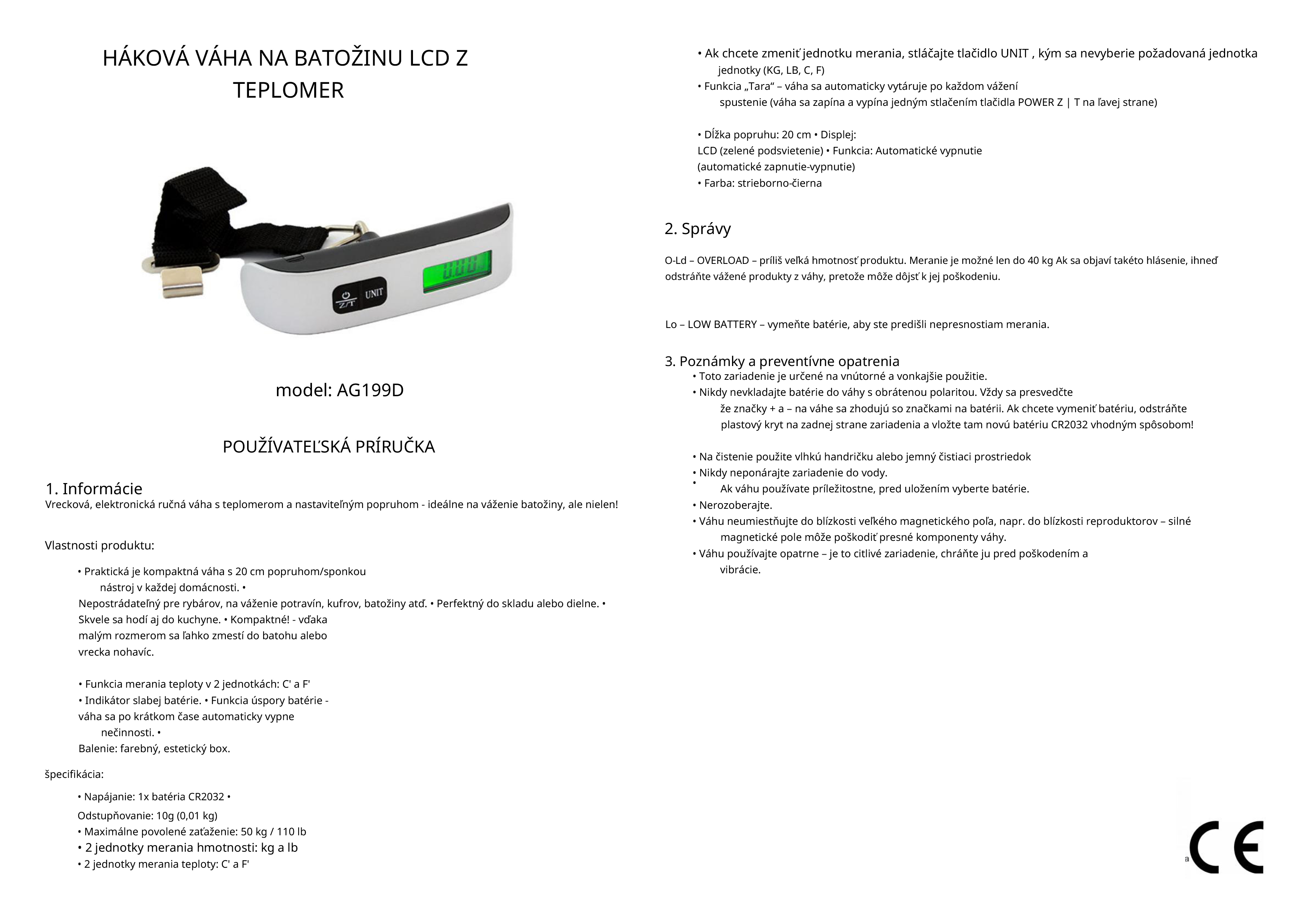 Táto vrecková elektronická váha je praktickým pomocníkom pri cestovaní, rybolove aj bežnom používaní doma. Umožňuje rýchlo a presne odvážiť kufre, batožinu, potraviny či iné predmety do hmotnosti 50 kg. Vďaka kompaktným rozmerom sa ľahko zmestí do batohu alebo vrecka a je vždy poruke, keď ju potrebujete.