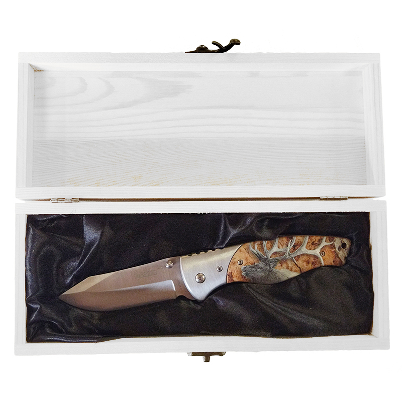 Kvalitný celokovový vreckový nožík značky Kandar dekorovaný v loveckom štýle. Nôž je zabalený v drevenej darčekovej krabičke s gravírovaným vzorom vystlanej saténom. Nôž má črienky vyrobené z pevného ľahkého plastu. Na bočnej strane má sponu, ktorou si môžete nožík pripevniť k opasku alebo k nohaviciam. Na čepeli sa nachádza kolík, ktorým si otvoríte nôž pohybom prsta jednej ruky. Kolík sa nachádza po obidvoch stranách čepele, to znamená že nôž je vhodný pre pravákov aj ľavákov.
