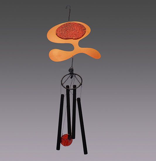 Zvonkohru tvorí háčik na zavesenie, 4 duté plechové rúrky a ozdobné ornamenty. Celková dĺžka pri zavesení: 90cm. Dĺžka rúriek: 28cm.