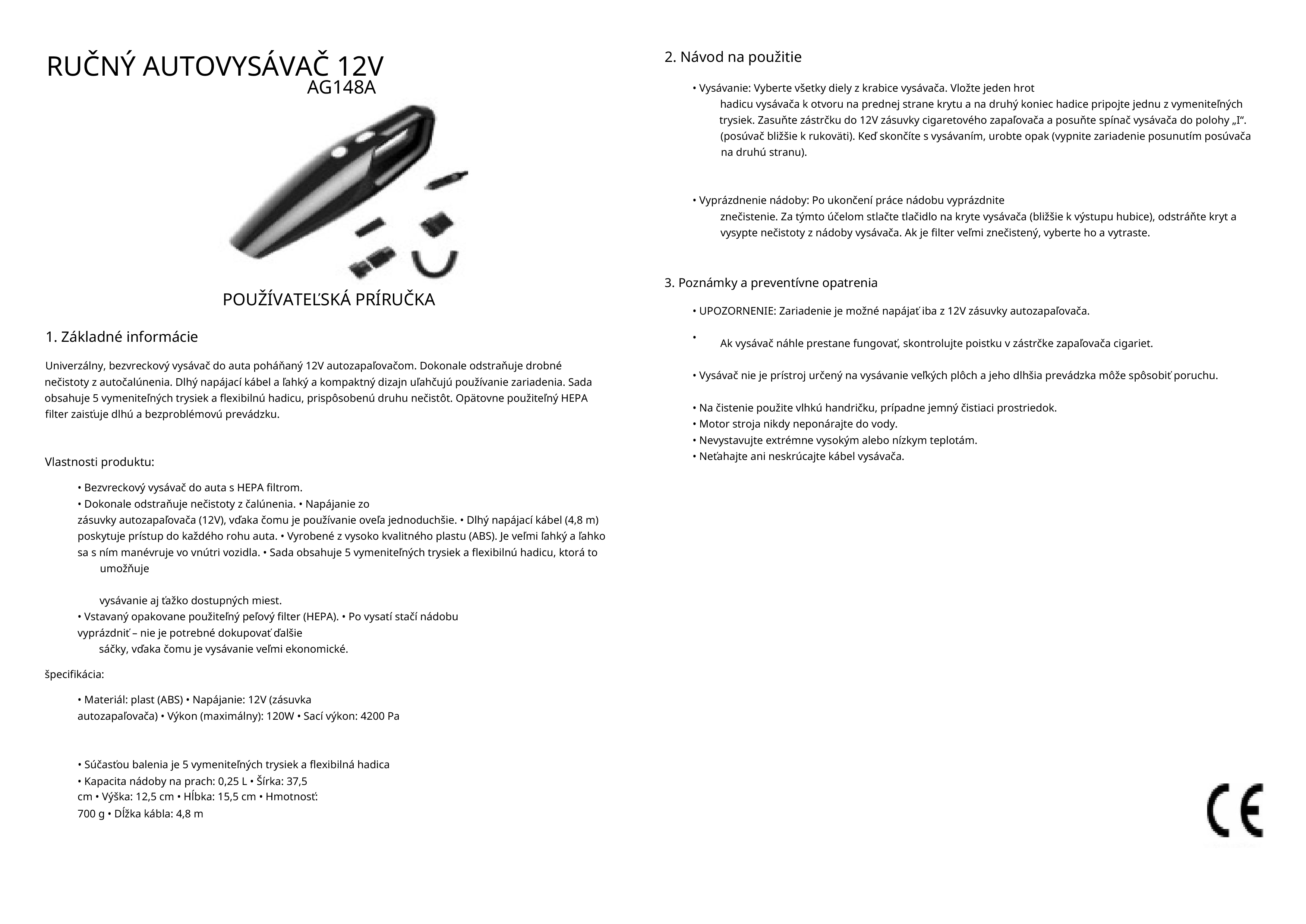 Akumulátorový a bezvreckový vysávač do auta napájaný vstavanou batériou. Dokonale odstraňuje drobné nečistoty z autočalúnenia. Ľahký a kompaktný dizajn výrazne uľahčuje používanie zariadenia. Sada obsahuje 2 vymeniteľné koncovky a flexibilnú hadicu (predlžovaciu), prispôsobenú rôznym druhom nečistôt. Opätovne použiteľný HEPA filter zaisťuje dlhú a bezproblémovú prevádzku. Sada obsahuje aj napájací USB kábel pre nabíjanie batérie.