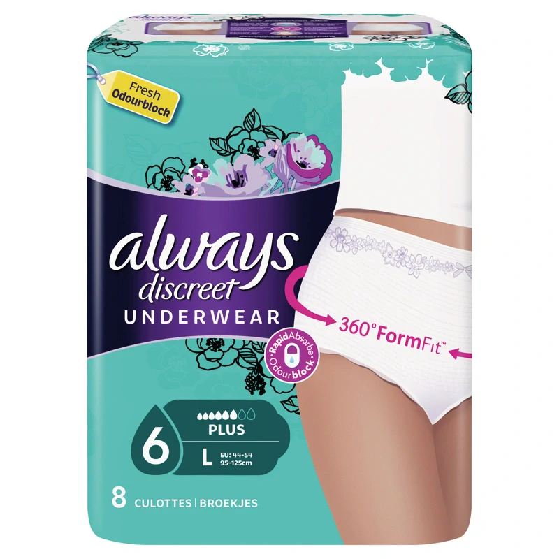 Dvojitá ochrana proti pretečeniu pomáha predchádzať pretečeniu. Ženský dizajn, nohavičky s vysokým pásom, príjemne mäkká tkanina podobná bavlne. Inkontinencia nemusí byť dôvodom na nečinnosť. S inkontinenčnými nohavičkami Always Discreet plus veľkosti L môžete pokračovať vo svojich bežných aktivitách