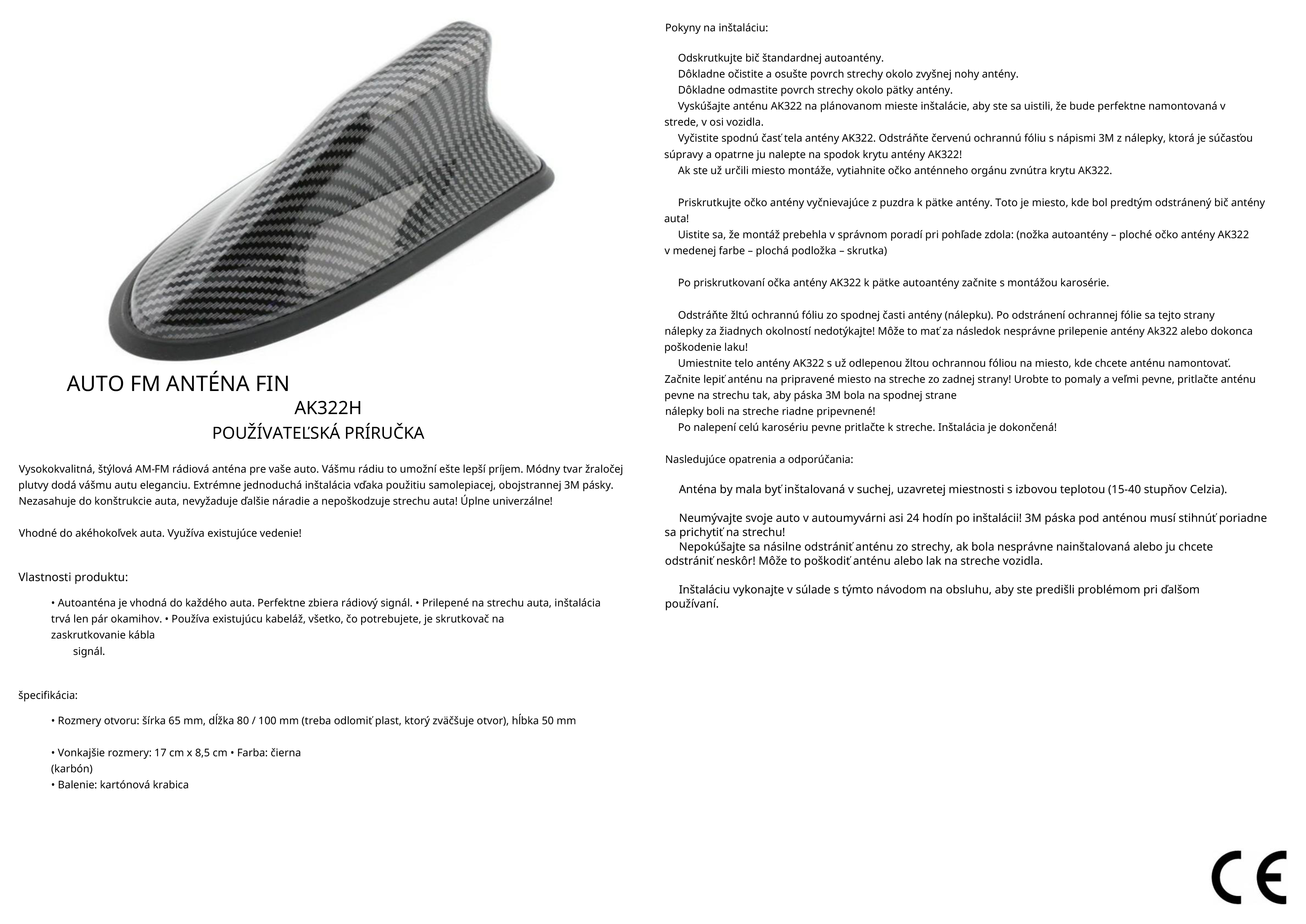 Okrem funkčnosti vyniká aj dizajnom – karbónové prevedenie dodá vozidlu športový a elegantný vzhľad. Anténa je úplne univerzálna a vhodná pre všetky značky a modely áut vybavené rádiovou inštaláciou.