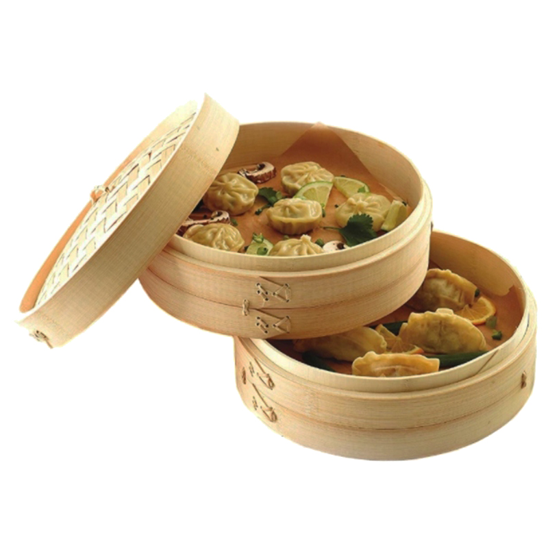 Okrúhly bambusový paráčik s dvoma úrovňami s priemerom 15 cm je orientálny naparovač. Pozostáva z 3 prvkov: dvoch úrovní a veka.