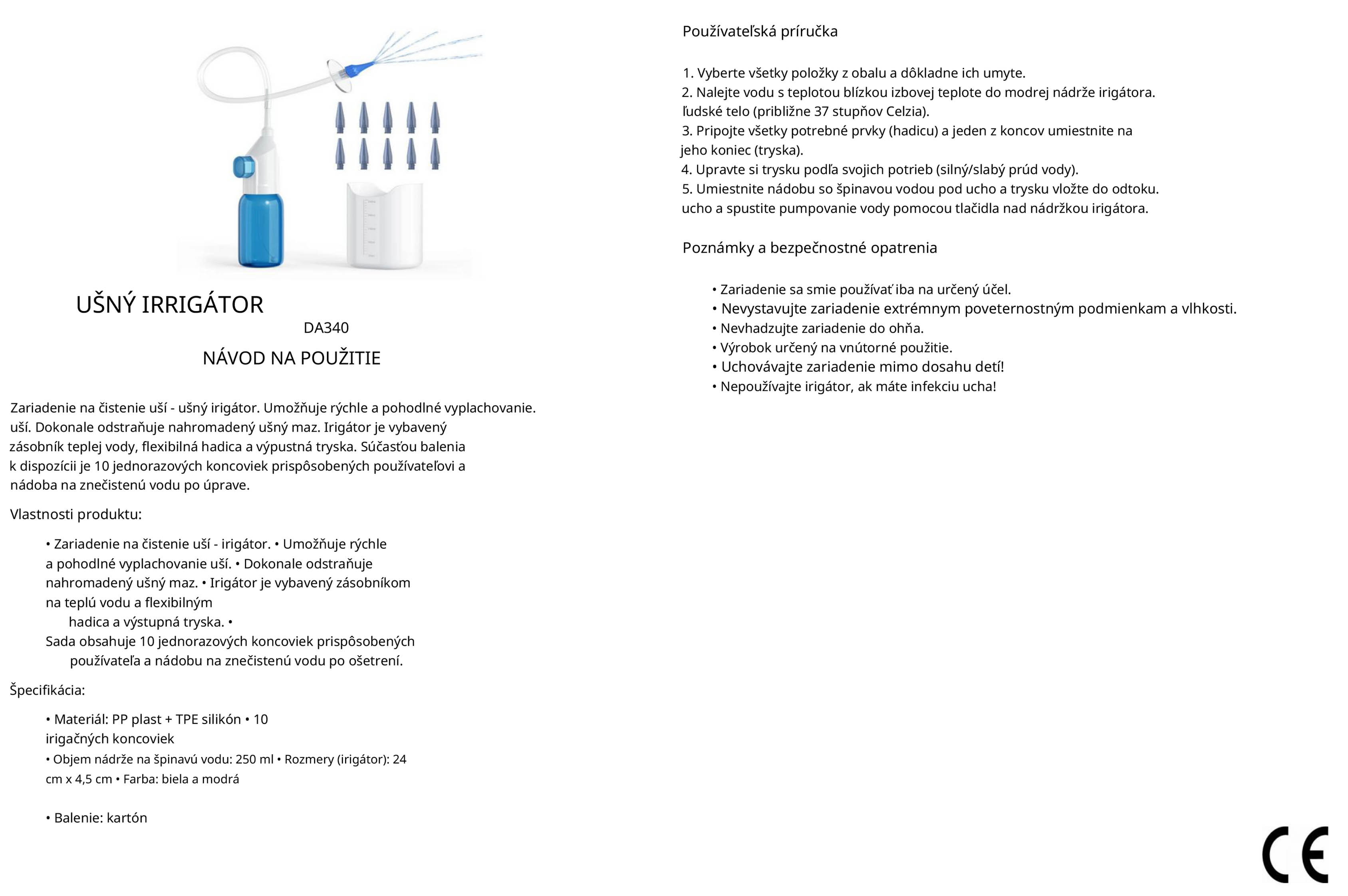 Zariadenie nepoužívajte pri bolesti ucha, zápale, perforácii bubienka alebo po chirurgických zákrokoch bez konzultácie s lekárom. Nepoužívajte horúcu vodu. Vyplachovanie vykonávajte jemne, bez nadmerného tlaku. Zariadenie nie je určené pre malé deti bez dozoru dospelej osoby. Používajte výhradne dodané alebo kompatibilné koncovky.