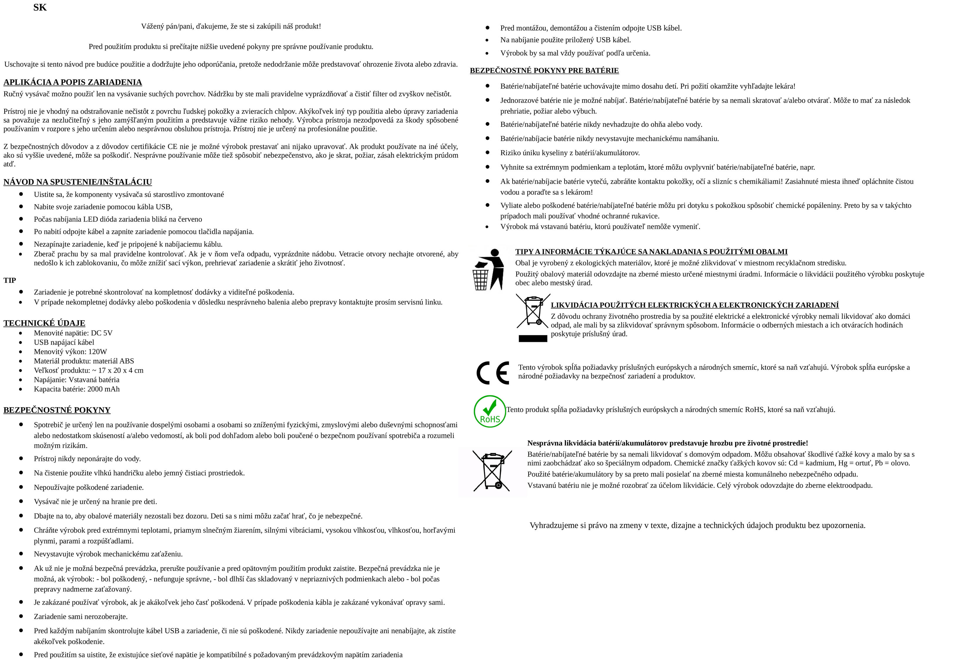 Vysávač je vybavený výkonnou batériou, nabíjanou cez USB kábel. Sada obsahuje dva nástavce na uľahčenie čistenia.