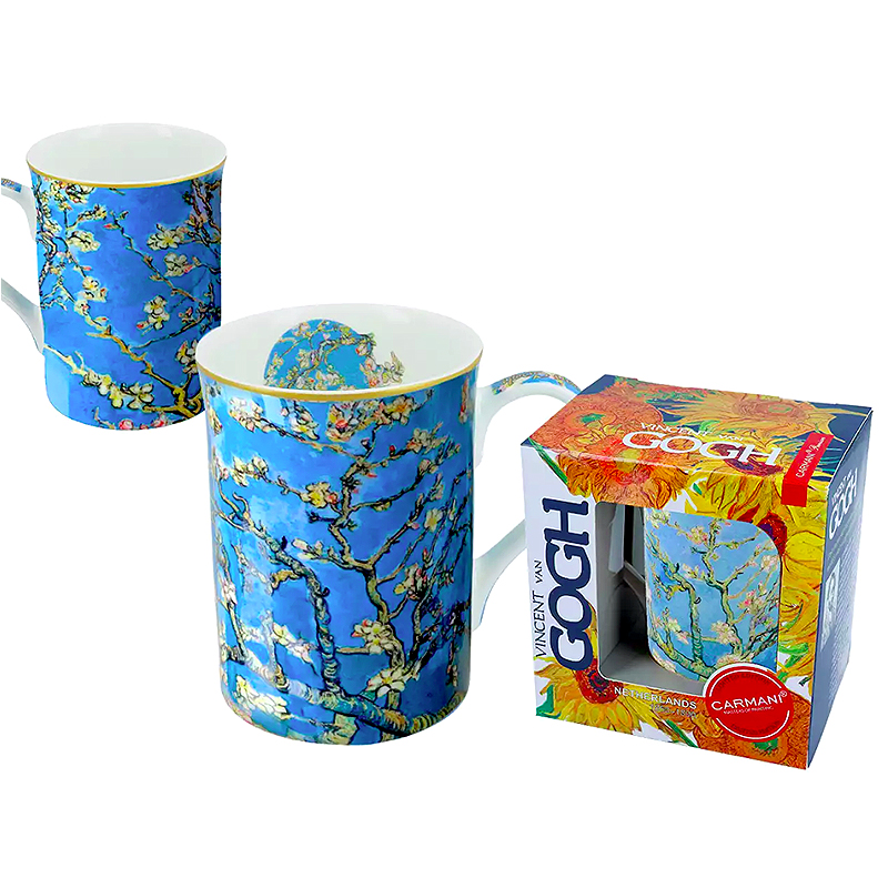 Exkluzívny porcelánový hrnček v darčekovej krabičke s motívom obrazu V.V.Gogha z obdobia impressionizmu Almond Blossom z kolekcie Carmani.