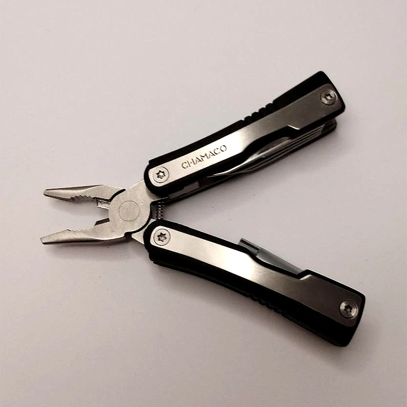 CHAMACO - Multifunkčné kliešte, ktoré má 7 funkcií. Kliešte sú vhodné pre milovníkov turistiky a domácich majstrov, ale sú vhodné aj na survivalové aktivity. Kliešte majú aj pílku, otvárače, svietidlo, skrutkovač, čepeľ.