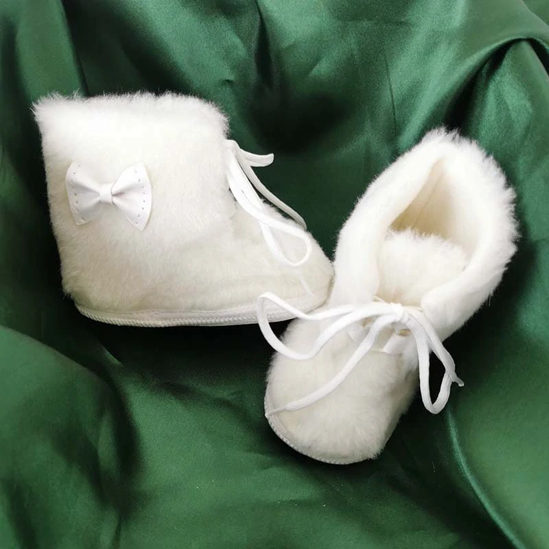 Tieto biele capačky s kožušinkou krásne doplnia zimný overal, pletenú čiapku alebo svetrík. Sú skvelým darčekom pre novorodenca, na krstiny, Vianoce či ako doplnok do výbavičky.