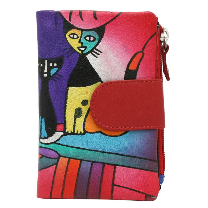 Peňaženka je zdobená ručne maľovanými abstraktnými mačkami v intenzívnych odtieňoch fialovej, žltej, ružovej a čiernej, ktoré harmonicky kontrastujú s červeným pozadím. Celý dizajn dopĺňa modro-zelený akcent, ktorý podčiarkuje umelecký charakter tohto modelu. Vzor pripomína moderné maliarske diela, vďaka čomu je tento doplnok nielen funkčný, ale aj esteticky výnimočný.