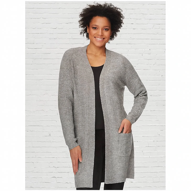Strih: dlhý kardigan bez zapínania, s dvomi vreckami vpredu