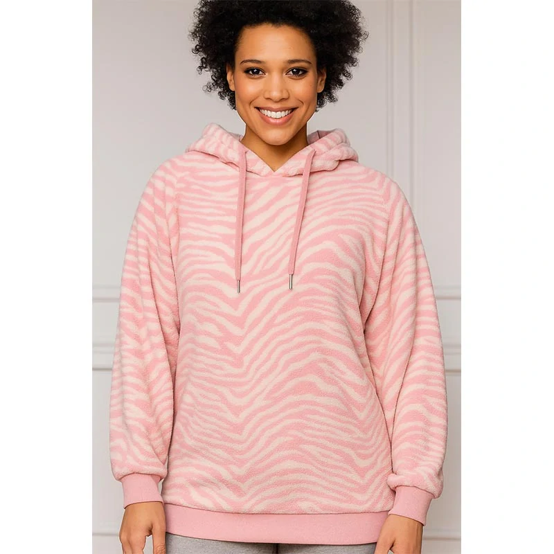 Tento dámsky mikinový sveter s kapucňou v jemnom ružovo-bielom zebra vzore je dokonalou kombináciou štýlu a pohodlia. Mäkký a hrejivý materiál z mikroplyšu (100 % polyester) zaručuje maximálny komfort počas chladnejších dní, či už ste doma, na prechádzke alebo na víkendovom výlete.