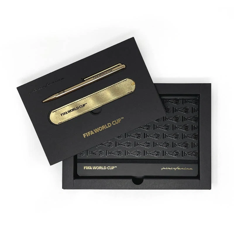 Darčeková sada Pininfarina Writing Set FIFA je luxusný doplnok pre všetkých, ktorí milujú prémiové materiály, dizajn a futbalovú tematiku v elegantnom podaní. Tento set spája dve exkluzívne položky – zlaté guľôčkové pero Pininfarina GrafeeX a štýlový poznámkový blok A5 z ekologického kamenného papiera. Všetko je zabalené v prémiovej darčekovej krabičke s emblémom FIFA World Cup™, ktorá pôsobí mimoriadne reprezentatívne.