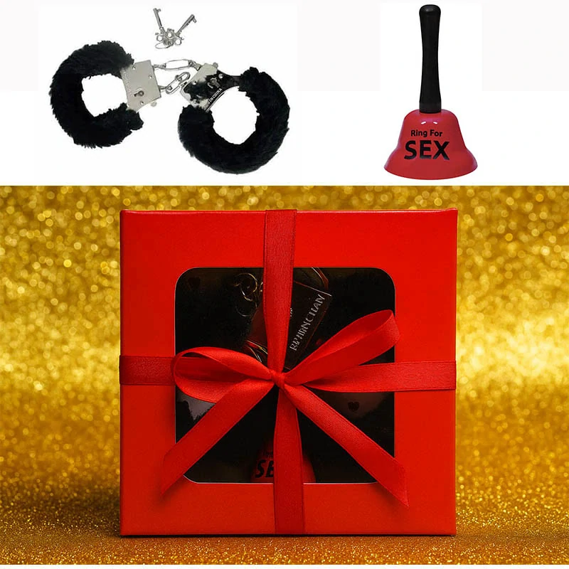- Darčeková sada s putami a zvončekom „Ring for Sex“ v červenej krabičke 15×15×3 cm