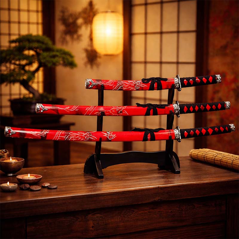 - Dekoračná sada 3 japonských mečov katana s červeným puzdrom a stojanom