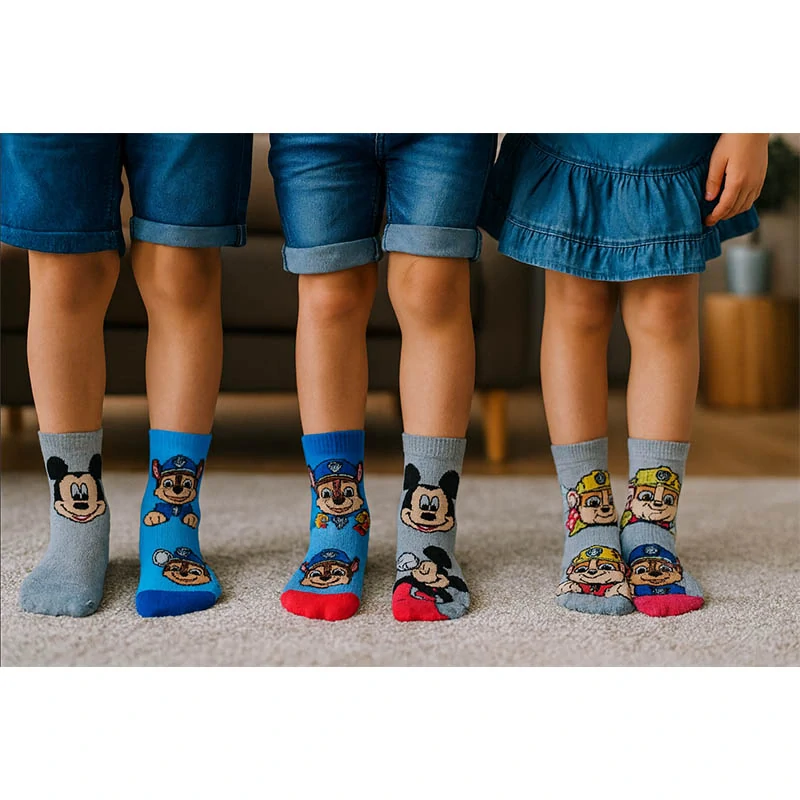 Každý pár ponožiek je iný – v balení sa nachádzajú dizajny s postavičkami ako Chase, Rubble, Skye či samotný Mickey Mouse. Tieto obľúbené hrdinské a zábavné motívy urobia z obliekania radosť.