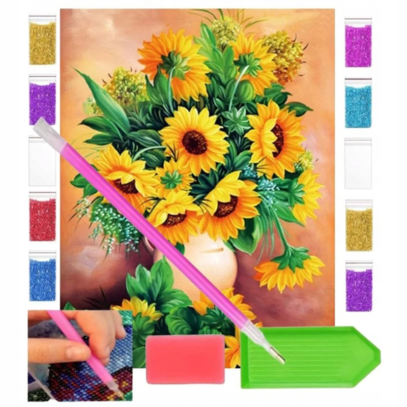 ŠPECIFIKÁCIA - vzor: Slnečnice; rozmery : 40x30 cm; tkanina potiahnutá lepiacou vrstvou : áno; sada obsahuje : farebné diamanty, aplikátor, suché lepidlo, nádoba; hmotnosť : 0,1 kg;