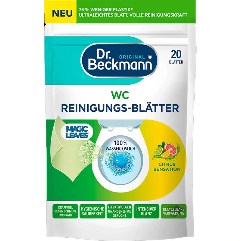 Dr. Beckmann WC čistiace listy Magic Leaves Citrus Sensation 20 ks predstavujú revolučný spôsob čistenia toalety – účinný, praktický a ekologický. Ušetríte miesto, chránite prírodu a získate hygienicky čistú toaletu so sviežou citrusovou vôňou.